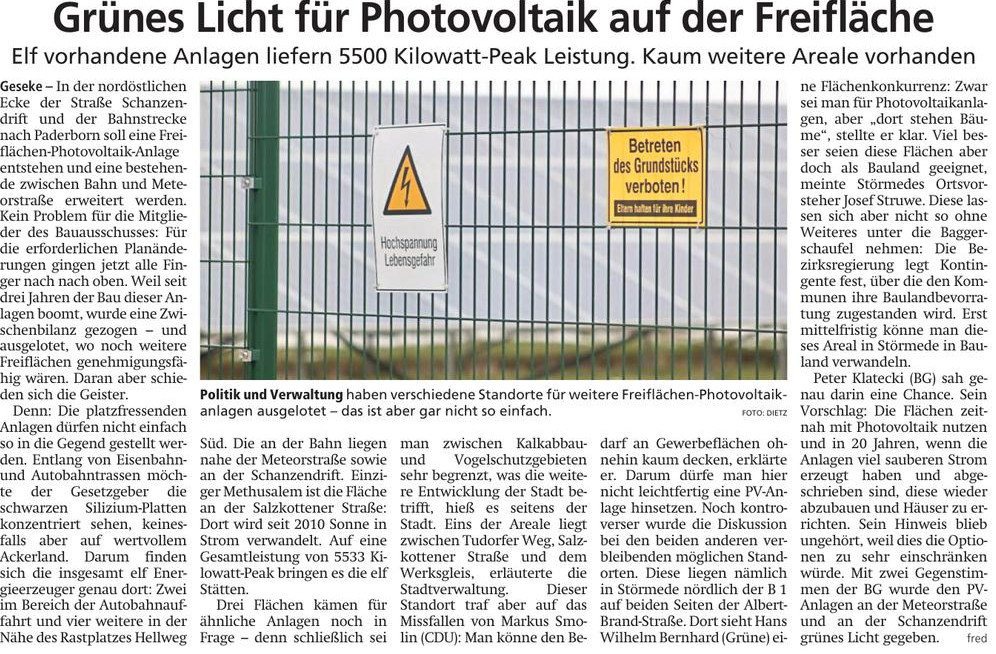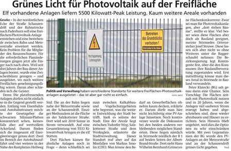 Heute wurde in der Geseker Zeitung über die Beratung im letzten Bauausschuss (11.02.) von geplante Erweiterungen sowie Anträge für Neuerrichtung von Flächen-Photovoltaikanlagen berichtet. (Bild rechts)