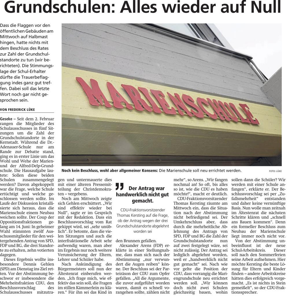 Das der Rat der Stadt Geseke am 29.06. diesen Empfehlungsbeschluss abgelehnt hat, stößt bei uns auf großes Unverständnis. Nach unserer Meinung wird hier, aus einer gewissen Parteiraison heraus, die Kompetenz eines Fachgremiums in Frage gestellt! Es bleibt nur zu hoffen, dass im Sinne aller Beteiligten(Schüler, Lehrer, Eltern) es am Ende doch noch zu einer tragfähigen Lösung kommt.