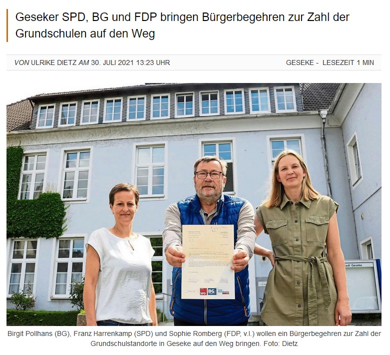 Heute wurde ein gemeinsamer Antrag (SPD, FDP und BG) auf ein Bürgerbegehren eingereicht. Nach dem Hin und Her durch die CDU Fraktion ohne eindeutige Aussage fordern wir die eindeutige Positionierung in dieser wichtigen Frage. Die Presse war informiert und berichtet unmittelbar. Ulrike Dietz schreibt über den Antrag direkt auf der Homepage vom Patrioten/Geseker Zeitung.