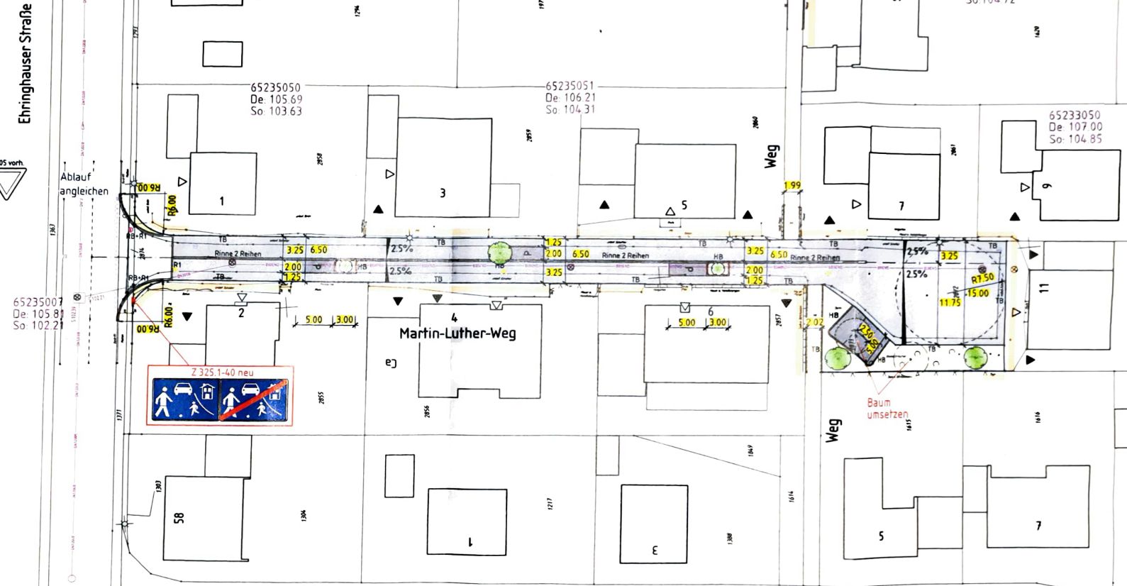 Im Bauausschuss stand der Beschluss über den Endausbau des Martin-Luther-Weges an. Geplant ist der Ausbau als Spielstraße mit drei (3!) ausgewiesenen Parkbuchten und Baumbeeten.